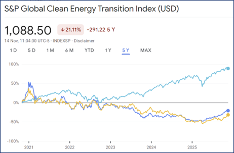 S&P Global Clean Energy Index (dark blue) vs European Renewable Energy Index (ERIX, yellow), vs S&P500 (light blue), last 5 years to Friday 14 November. Source: Google